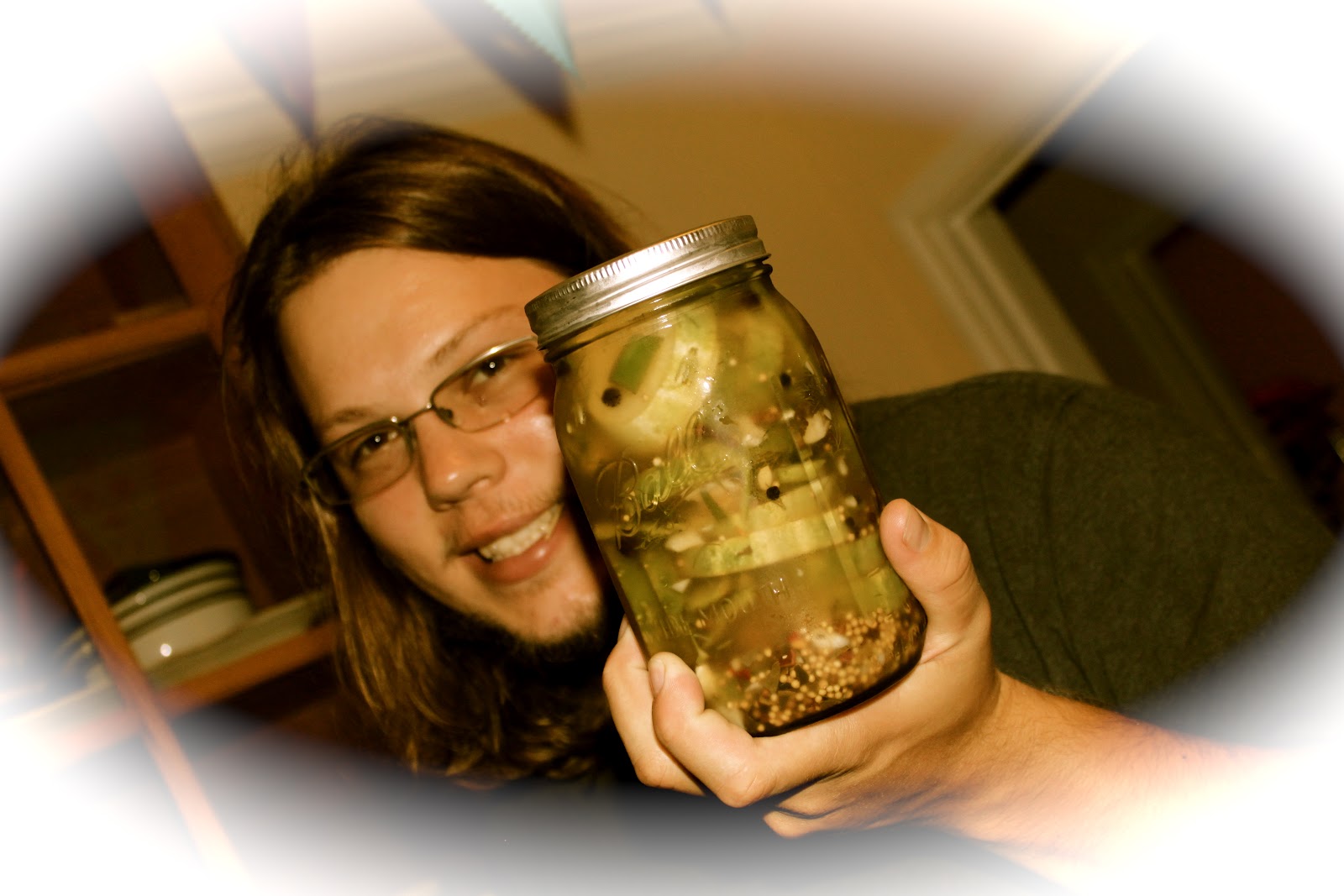 He chose a recipe from the book called "Dinosaurs Bar-B-Que". He does not actually have the book, but has found recipes he likes from it online. Since he is more adventurous than I am, he tweaked the recipe a little bit so here it is(with Hollands edits from what he changed-not much). Be sure to pickle the cucumbers for about two weeks in the fridge. We will enjoy these when we get back from Canada!